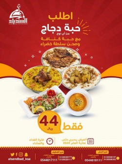 عروض متنوعة ومتجددة من « مطعم ومطبخ السندباد » اطلب حبة دجاج من أي نوع.. مع كنافة وسلطة خضراء. بـ 44 ريال فقط العرض متوفر في فترتي الغداء والعشاء . ... |