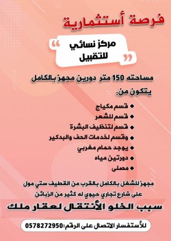 مركز نسائي للتقبيل مساحته 150 متر دورين مجهز بالكامل قسم مكياج قسم شعر قسم لتنظيف البشرة قسم لخدمات الحف والبدكير يوجد حمام مغربي ... |