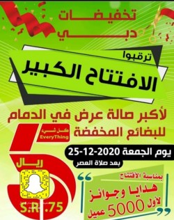 ترقبوا الافتتاح الكبير لاكبر صالة عرض بالدمام للبضائع المخفضة "تخفيضات دبي" يوم الجمعة 25 ديسمبر بعد صلاة العصر... بمناسبة الافتتاح هدايا وجوائز لأول 5000 عميل... الوجهة الرئيسة لكل احتياجات الأسرة: تحف وهدايا ملابس اكسسوارات ... |