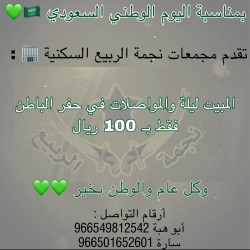 عرض مجمعات نجمة الربيع بمناسبة اليوم الوطني _بمناسبة اليوم الوطني السعودي المواصلات من القطيف إلى حفر الباطن والمبيت ليلة في مجمعات نجمة الربيع السكنية ب 100 ريال فقط _المواصلات يومية من القطيف إلى حفر الباطن والعكس |