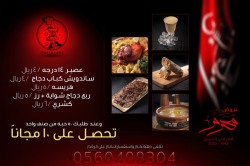عروض محرم وصفر من مطبخ ومطعم السندباد ربع دجاجة محموص بـ 8 ريال. حبة دجاج محموص بـ 30 ريال. أو لـحـــم بريـاني بـ 6.50 ريال. حبـة دجـــاج كاملة بـ 24 ريـال. ... |