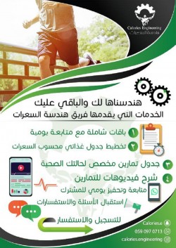 ⚙️ برنامج هندسة السعرات⚙️ 💫نضمن لكم حياة صحية 💫 الان مع هندسة السعرات نوفر لكم أنظمة غذائية مع متخصصين تغذية ومدربين رياضة. تناسب حتياجاتكم تحت باقات متنوعة: ⚙️ باقة نزول الوزن باقة يتم فيها تخطيط برنامج غذائي يساعد على نزول الوزن بشكل صحي ومدروس ... |