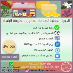 دورة تدريبية لصناعة الصابون الطبيعي 🍃 هل ترغب/ين في تعلم هواية جديدة؟ هل ترغب/ين بفتح باب رزق جديد وافتتاح مشروع خاص بنسبة نجاح كبيرة؟ هل ترغب/ين في صناعة صابون طبيعي وآمن لجميع أفراد العائلة؟ ——— لأول مره✨ يقدم مركز العناية الطبيعية دورة صناعة الصابون بالطريقة الباردة «صناعة الصابون من الصفر»، مع توفير كافة المواد والأدوات والتطبيق عمليًا وبشكل مباشر بإشراف خبيرة في صناعة الصابون لأكثر من ثمان سنوات. |