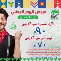 عروض مميز من «نظارات نور» بمناسبة اليوم الوطني 90 .. ✓العرض الأول: ✨ نظارة شمسية من العرض 90 ريالًا ✓العرض الثاني: ✨ فريم نظارة طبية من العرض 70 ريالًا |