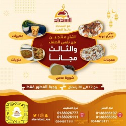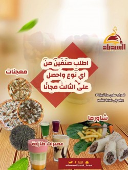 لا تفوّت عروض شهر يونيو من مطعـم ومطبــخ السندبــاد عرض الغــداء: اشتر حبة دجاج شواية واحصل على كنافة وسلطة خضراء مجانـا. عرض العشـــاء: اشتر منتجين من أي نوع ”معجنات - شاورما - عصيرات “ واحصل على الثالث مجانا. أو اطلب كيلو مشــاوي واحصل على كنافة ومقبلات مجانا. ... |
