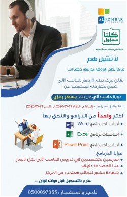 يعلن مركز نظم الإزدهار للحاسب الآلي ضمن مشاركته المجتمعية عن دورة حاسب آلي عن بعد Online «بسعر رمزي» مدة البرنامج: خمسة أيام ابتداء من يوم الثلاثاء الموافق 19 - 5 - 2020 اختر واحدا من البرامج والتحق به Word // Excel // PowerPoint للاستفسار يرجى التواصل على الرقم التالي: 0500097355 للتسجيل يرجى الضغط على الرابط ... |