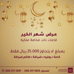 عرض شهر الخير مركز الأمير فيصل بن فهد للمناسبات يقدم لكم العرض الأقوى والأوفر الفرص المميزة تحدث مرة واحدة فقط في الحياة، فأنتهز الفرصة واحجز قاعتك الملكية المميزة. |