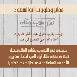 خدمات مخابز وحلويات أبو السعود ”متاحة“ أيام العيد يهنئكم بقرب حلول عيد الفطر المبارك... ويعلن بأن فرع التوبي بشارع الملك فيصل سيكون تحت خدمتكم خلال أيام العيد ابتداء من يوم الأحد من الساعة 8:00 صباحا إلى 2 ظهرا..... |