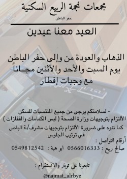 تعلن مجمعات نجمة الربيع السكنية عن الذهاب والعودة من وإلى حفر الباطن يوم السبت والأحد والأثنين مجانا مع وجبة الأفطار لسلامتكم يرجى من جميع المنتسبات للسكن و غير المنتسبات للسكن الألتزام بتوجيهات وزارة الصحة «لبس الكمامات والقفازات» كما ننوه على ضرورة الألتزام بتوجيهات مشرف / ة الباص في ترتيب الجلوس للتواصل.. صالح ربيع: 0566016333 ابو هبة: 0549812542 تابعونا على تويتر والانستغرام: ... |