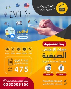 تنطلق دوراتنا الصيفية في نادي اللغة الإنجليزية الإلكتروني بنظام التعليم عن بعد على منصة «Zoom». احضري معانا.. 3 أيام بالأسبوع في موعد ووقت ثابت لمدة شهر ونصف.. أي ما يعادل 3 حصص مدرسية تقريبا، «تتخللها استراحة 10 دقائق». تتم اختبارات تحديد المستوى إلكترونياً عن طريق ارسال رابط لكل طالبة قبل الدورة. الوقت واليوم يعتمد على مستواك.. ونبدأ من 4 عصراً إلى 10:30 مساء. ايش تنتظري!!.. يلا انضمي معانا الآن في دورة مدتها 6 أسابيع.. نتعلم مهارات اللغة الإنجليزية... |