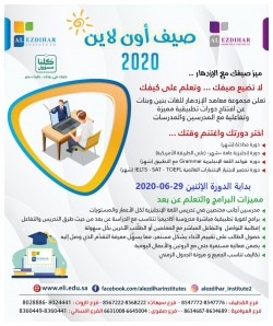 تحت إشراف وزارة التعليم «بنين وبنات».. تعلن مجموعة معاهد الإزدهار للغات عن بدء دورات «صيف 2020» المتنوعة عن بُعد. برامج لغوية تطبيقية مباشرة مدروسة أكاديميا تتناسب مع الدراسة عن بُعد من حيث طرق التدريس والتفاعل. استغل الوقت واختر ما يناسبك.. دورات إنجليزي عامة. دورة انجليزي بالتركيز على قواعد اللغة. دورة مكثفة للتدريب على التحدث بالإنجليزية. ... |