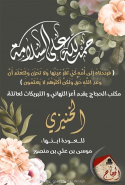مكتب الحجاج للاستثمار والتطوير العقاري يقدم أعز التهاني والتبريكات إلى عائلة الخنيزي لعودة ابنها موسى بن علي بن منصور الخنيزي.. |