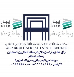 الآن... بإمكانك توثيق عقد إيجارك من خلال الوسطاء العقاريين المعتدين في مكتب عبد الله عبد القادر بن عبد الله ال عبد الحي العقاري.... يسعدنا خدمتكم... خدماتنا: تأجير وبيع أراضي وشقق وفلل ودبلوكسات بالإضافة إلى خدمة توثيق وإنشاء العقود إلكترونياً.... - ساعات الدوام: 9 إلى 12ظهراً ومن 4 إلى 9 مساءً ... |
