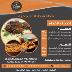 بمناسبة إفتتاح وجبة الغداء ب مطعم دانات المحبة "طعم الذواقة" أحصل على عرض30% لمدة 3 أيام ابتداء من الخميس 17 / 7 / 1441 ... كما يسعدنا خدمتكم بألذ الاطباق فترة العشاء : |
