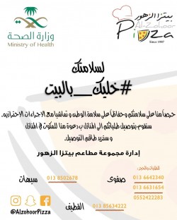 مطعم بيتزا الزهور وتفاعلا مع حملة #سلامتك و#خليك_بالبيت... وحرصا على سلامتكم وحفاظا على سلامة الوطن وتماشياً مع الاجراءات الاحترازية. سنقوم بتوصيل طلباتكم إلى المنازل بدعوة منا للمكوث في المنازل ”سنزيد طاقم التوصيل“... |
