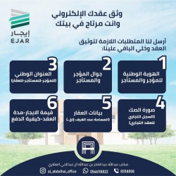 وثق عقدك الإلكتروني وانت مرتاح في بيتك لدى مكتب عبد الله عبد القادر العقاري أرسل لنا المتطلبات اللازمة لتوثيق العقد وخلي الباقي علينا. المتطلبات: 1_الهوية الوطنية للمؤجر والمستأجر. 2 - جوال المؤجر والمستأجر. 3 - العنوان الوطني «للمؤجر - للمستأجر - للعقار». 4 - صورة الصك «السجل التجاري للعقد التجاري» ... |