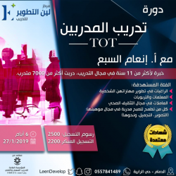 ينظم مركز لين التطوير دورة تدريب المدربين TOT، بشهادة معتمدة من المؤسسة العامة للتدريب التقني والمهني TVTC. وتستمر الدورة على مدى 6 أيام للسيدات. الفئة المستهدفة: ◼المعلمات والتربويات. ◼العاملات في مجال التثقيف الصحي. ◼كل من ... |