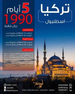 رحلاتنا على مدار العام عدا المواسم والإجازات .. 10 أيام - 3750 ريال 15 يوم - 4400 ريال 21 يوم - 5250 ريال 30 يوم - 6400 ريال مميزاتنا: السكن في فنادق 5 نجوم ورحلاتنا على ... |