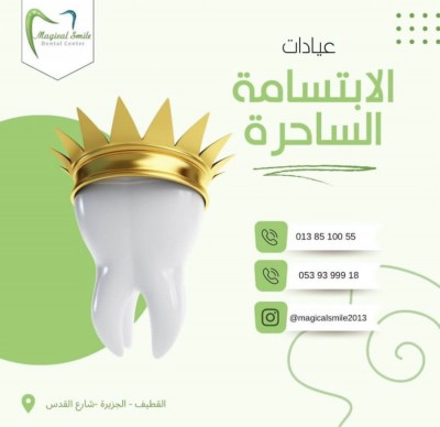 ”مجمع الإبتسامة الساحرة الطبي“ مجمع عيادات متخصص في علاج وتقويم وتجميل الأسنان تحت إشراف طاقم ذو خبرة عالية ومهارة. عرض نهاية العام الانستغرام: https://instagram.com/magicalsmile2013 موقعنا: القطيف - حي الجزيرة - مقابل مركز الجراش... |