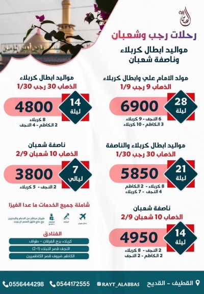 رحلات رجب وشعبان .. مواليد أبطال كربلاء وناصفة شعبان✨ 🔹 مولد الإمام علي (ع) وأبطال كربلاء | 28 ليلة 📅 الذهاب: 9 رجب 🕌 (6 نجف، 9 كربلاء، 10 كاظم، 3 كربلاء) 💰 6900 ريال 🔹 مواليد أبطال كربلاء والناصفة | 21 ليلة 📅 الذهاب: 30 رجب ... |