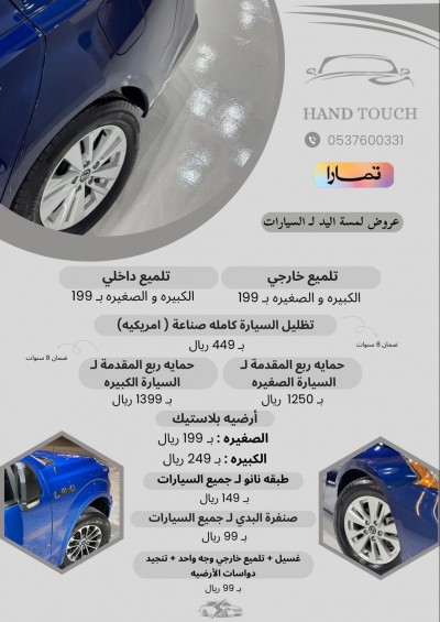 ✨ عروض ما تتفوت من لمسة اليد للسيارات ✨ 🚗 تلميع خارجي للسيارات الصغيرة والكبيرة فقط بـ 199 ريال! 🚙 تلميع داخلي للسيارات الصغيرة والكبيرة فقط بـ 199 ريال! 🌟 تظليل كامل للسيارة (صناعة أمريكية) بـ 449 ريال مع ضمان 8 سنوات! 🛡️ حماية ربع المقدمة: الصغيرة بـ 1250 ريال الكبيرة بـ 1399 ريال ... |