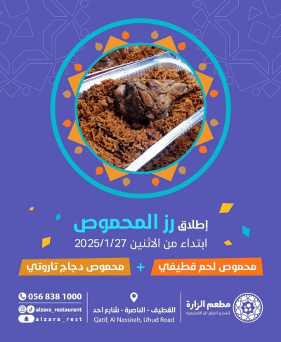 " مطعم الزارة" نقدم لكم تجربة ذواقة مذهلة مع نكهات لا تُقاوم من قلب القطيف وتاروت! محموص اللحم القطيفي: نكهة غنية ومتوازنة تأخذك إلى عالم من التوابل الأصيلة واللحم الطري. محموص الدجاج التاروتي: تجربة لا مثيل لها مع الدجاج المتبل بالأعشاب والتوابل التاروتية الفريدة. العرض الخاص: كل يوم الاثنين والثلاثاء 📞 للحجز والاستفسار: 0568381000 الانستغرام: ... |
