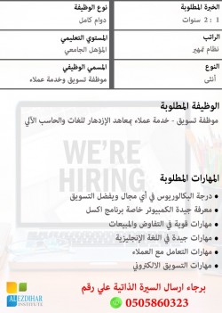 يعلن معهد الازدهار للغات والحاسب الآلي عن حاجته لموظفة تسويق وخدمة عملاء، حاصلة على درجة البكالوريوس وخبرة لا تقل عن سنة.