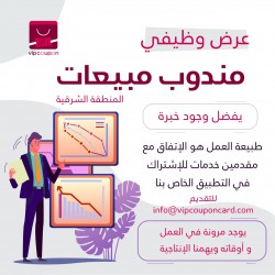 أعلنت مؤسسة القسيمة المميزة التجارية بالمنطقة الشرقية عن حاجتها لمندوب /مندوبة مبيعات. فمن لديه الرغبة ارسال السيرة الذاتية على البريد الإلكتروني: [email protected]... |