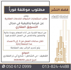 يعلن مكتب استثمارات الشواف للخدمات العقارية عن فرصة وظيفية في مجال التسويق العقاري. الشروط: من لديها القدرة على أداء المهام بجودة عالية والتعاون والإخلاص في العمل التقدم فورًا. ساعات العمل: من الثانية ظهرًا إلى التاسعة مساءً «عدا الجمعة إجازة». الراتب: يتم تحديده بعد المقابلة. الموقع: القطيف - حي الشاطئ - شارع أبي ذر الغفاري تاريخ الإعلان: 3 أغسطس 2020 للتواصل: 0506120999 - 0138244488... |