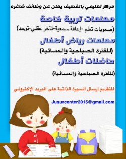 يعلن مركز إيلاف لرعاية وتأهيل الأطفال المعاقين وذوي الاحتياجات الخاصة عن وظائف شاغرة: ♦أخصائية نطق وتخاطب حاصلة على بطاقة الهيئة وسارية المفعول. ♦ أخصائية نفسية ملمة بكافة المقاييس ولديها بطاقة الهيئة سارية المفعول. ♦ممرضة حاصلة على بطاقة الهيئة سارية المفعول. ♦أخصائيات تربية خاصة، إعاقة فكرية، تخلف عقلي تخضع جميع المتقدمات للمفاضلة.... من تجد لديها الرغبة عليها الإسراع للتقدم من خلال إرسال السيرة الذاتية .... ... |