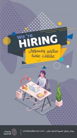 مؤسسة برمجة وتصميم ودعاية واعلان تبحث عن الوظائف التالية 1 - مسوق ومندوب مبيعات 2 - مبرمج تطبيقات ومواقع الكترونية ومحلل بيانات 3 - سكرتير ومسؤول علاقات 4 - مندوب مشتريات |