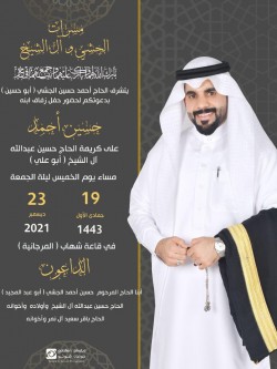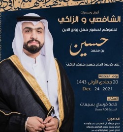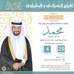 تحتفل عائلة البناي في القديح مساء يوم الجمعة بزفاف الشاب أحمد جعفر أحمد البناي في مجلس الحاج علي ناصر الصبيخي بحي الجوهرة بالقديح وسط فرحة الأهل والأصدقاء ومحبي العريسين. وعبر العريس عن سعادته الغامرة بدخوله القفص الذهبي، سائلا الله أن يوفقه وعروسه ويرزقهما الذرية الصالحة. أسرة ”جهينة الإخبارية“ تهنئ العريسين وعائلتيهما وتسأل الله ان يبارك لهما، متمنين لهما حياة سعيدة ‏ ...