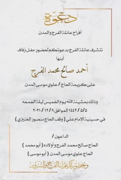 احتفلت عائلة آل درويش «القديح» وآل زواد «سيهات» مساء يوم الخميس بعقد قران الشاب منتظر عبد الخالق عبد الكريم آل درويش على كريمة الحاج عبد الله أحمد حمود آل زواد وسط فرحة الأهل والأصدقاء ومحبي العريسين. أسرة ”جهينة الإخبارية“ تهنئ العريسين وعائلتيهما وتسأل الله ان يبارك لهما، متمنين لهما حياة سعيدة ‏ ...