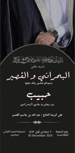 تحتفل عائلة البحراني والقصير في سنابس مساء يوم الجمعة بزفاف الشاب حبيب يعقوب علي البحراني على كريمة الحاج عبدالله جاسم القصير في حسينية السيد الخوئي بسنابس وسط فرحة الأهل والأصدقاء ومحبي العريسين. وعبر العريس عن سعادته الغامرة بدخوله القفص الذهبي، سائلا الله أن يوفقه وعروسه ويرزقهما الذرية الصالحة. أسرة ”جهينة الإخبارية“ تهنئ العريسين وعائلتيهما وتسأل الله ان يبارك لهما، متمنين لهما حياة سعيدة ‏ ...