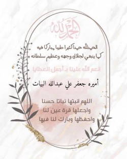 رُزق الشاب جعفر علي عبدالله البيات بمولودة اتفق وحرمه أميرة معتوق الشلاتي على تسميتها «أميرة». أسرة ”جهينة الإخبارية“ تبارك له على المولودة جعلها الله من مواليد السعادة واقر الله بها عين والديها. ‏ ...