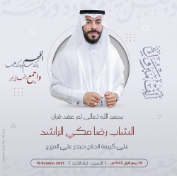 احتفلت عائلة الراشد والمزرع في سيهات مساء يوم السبت بعقد قران الشاب رضا مكي الراشد على كريمة الحاج حيدر علي المزرع وسط فرحة الأهل والأصدقاء ومحبي العريسين. أسرة ”جهينة الإخبارية“ تهنئ العريسين وعائلتيهما وتسأل الله ان يبارك لهما، متمنين لهما حياة سعيدة ‏ ...