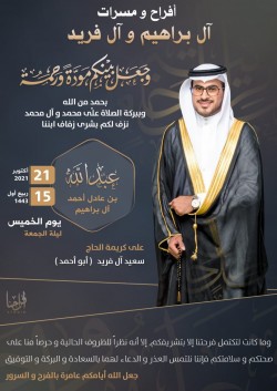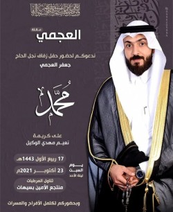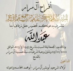 احتفل عبدالله بن عبدالهادي الجباره بقرار ترقيته إلى المرتبة الخامسة بمكتب وزارة البيئة والمياه والزراعة بمحافظة الاحساء. أسرة ”جهينة الإخبارية“ تتقدم بالتهنئة للسيد محمد متمنين له مزيداً من التوفيق والنجاح. ‏ ...