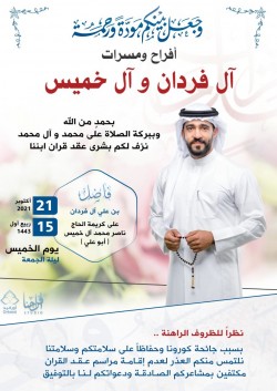 احتفلت عائلة آل فردان وآل خميس في صفوى مساء يوم الخميس بعقد قران الشاب فاضل علي آل فردان على كريمة الحاج ناصر محمد آل خميس وسط فرحة الأهل والأصدقاء ومحبي العريسين. أسرة ”جهينة الإخبارية“ تهنئ العريسين وعائلتيهما وتسأل الله ان يبارك لهما، متمنين لهما حياة سعيدة ‏ ...