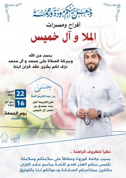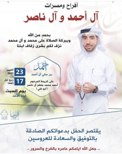 احتفلت عائلة النويصر بزواج ابنهم الشاب محمد أحمد يوسف النويصر وذلك مساء يوم الجمعه الموافق 1443/03/09 هـ بمدينة الدمام، جاء ذلك في ظل أجواء عائلية اقتصرت على حضور أقارب العريس والعروس، تماشيًا مع القرارات السامية بمنع التجمعات، وتنفيذاً للاحترازات الوقائية، لمنع تفشي فيروس كورونا كوفيد19، مقدمين اعتذارهم لجميع الأصدقاء والزملاء والجيران لعدم تقديم الدعوة لحضور الزواج، بسبب الظروف الحالية، وشاكرين منهم من حضر. وعبر العريس عن سعادته الغامرة بدخوله القفص الذهبي، ...