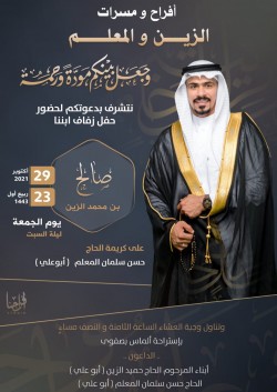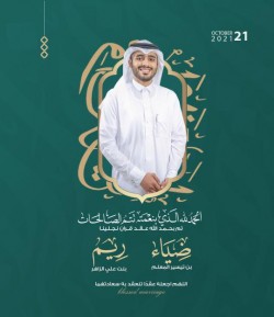 تحتفل عائلة شويهين والشيخ في القديح مساء يوم السبت بزفاف الشاب عبدالله علي محمد شويهين على كريمة الحاج جواد أحمد الشيخ «أبو محمد» وسط فرحة الأهل والأصدقاء ومحبي العريسين. وعبر العريس عن سعادته الغامرة بدخوله القفص الذهبي، سائلا الله أن يوفقه وعروسه ويرزقهما الذرية الصالحة. أسرة ”جهينة الإخبارية“ تهنئ العريسين وعائلتيهما وتسأل الله ان يبارك لهما، متمنين لهما حياة سعيدة ‏ ...