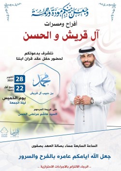 احتفلت عائلة آل قريش والحسن في صفوى مساء يوم الخميس بعقد قران الشاب محمد حبيب آل قريش على كريمة المرحوم السيد هاشم السيد مرتضى الحسن وسط فرحة الأهل والأصدقاء ومحبي العريسين. أسرة ”جهينة الإخبارية“ تهنئ العريسين وعائلتيهما وتسأل الله ان يبارك لهما، متمنين لهما حياة سعيدة ‏ ...