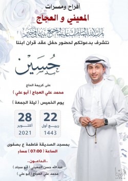 احتفلت عائلة المعيني والعجاج في صفوى مساء يوم الخميس بعقد قران الشاب حسين عبدالله حسن المعيني على كريمة الحاج محمد علي العجاج «أبو علي» بمسجد الصديقة فاطمة وسط فرحة الأهل والأصدقاء ومحبي العريسين. أسرة ”جهينة الإخبارية“ تهنئ العريسين وعائلتيهما وتسأل الله ان يبارك لهما، متمنين لهما حياة سعيدة ‏ ...