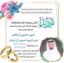 احتفلت عائلة آل قنبر وآل ثنيان في عنك «حي العليوات» مساء يوم الجمعة بعقد قران الشاب حسين أمين آل قنبر على كريمة الحاج حسين آل ثنيان وسط فرحة الأهل والأصدقاء ومحبي العريسين. أسرة ”جهينة الإخبارية“ تهنئ العريسين وعائلتيهما وتسأل الله ان يبارك لهما، متمنين لهما حياة سعيدة. ... |