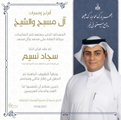 احتفلت عائلة المسبح والشيخ في أم الحمام مساء يوم الإثنين بعقد قران الشاب سجاد نسيم سلمان المسبح على كريمة الحاج عبدالعظيم أحمد الشيخ «أبوأحمد» وسط فرحة الأهل والأصدقاء ومحبي العريسين. أسرة ”جهينة الإخبارية“ تهنئ العريسين وعائلتيهما وتسأل الله ان يبارك لهما، متمنين لهما حياة سعيدة. ‏ ...