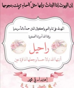 رُزق الشاب محمد ابراهيم الأبيض بمولودة اتفق وحرمه على تسميتها «راحيل». أسرة ”جهينة الإخبارية“ تبارك له على المولودة جعلها الله من مواليد السعادة واقر الله بها عين والديها. ‏ ...