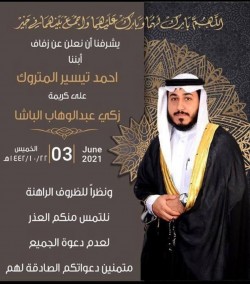 تحتفل عائلة المتروك والباشا في سيهات مساء يوم الخميس بزفاف الشاب أحمد تيسير المتروك على كريمة الحاج زكي عبد الوهاب الباشا وسط فرحة الأهل والأصدقاء ومحبي العريسين. وعبر العريس عن سعادته الغامرة بدخوله القفص الذهبي، سائلا الله أن يوفقه وعروسه ويرزقهما الذرية الصالحة. أسرة ”جهينة الإخبارية“ تهنئ العريسين وعائلتيهما وتسأل الله ان يبارك لهما، متمنين لهما حياة سعيدة. ‏ ...
