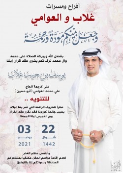 تحتفل عائلة غلاب والعوامي في صفوى مساء يوم الخميس بعقد قران الشاب يوسف حبيب غلاب على كريمة الحاج علي محمد العوامي «أبو حسين» وسط فرحة الأهل والأصدقاء ومحبي العريسين. أسرة ”جهينة الإخبارية“ تهنئ العريسين وعائلتيهما وتسأل الله ان يبارك لهما، متمنين لهما حياة سعيدة. ‏ ...