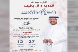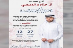 تحتفل عائلة آل سعيد وامسلم في سيهات مساء يوم الخميس بزفاف الشاب عباس عبد الوهاب آل سعيد على كريمة الحاج رأفت امسلم الزفة عصرا بمزرعة قمبر، ونظرا للظروف الراهنة تستقبل العائلة التهاني والتبريكات بالواتس آب اسرة ”جهينة الإخبارية“ تهنئ العريسين وعائلتيهما وتسأل الله ان يبارك لهما، متمنين لهما حياة سعيدة. ...