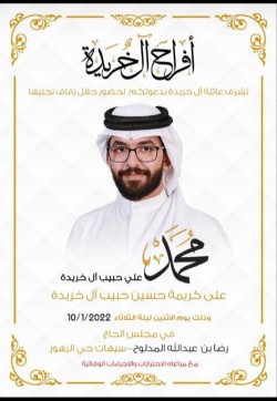 تحتفل عائلة آل خريدة في سيهات مساء يوم الإثنين بزفاف الشاب محمد علي حبيب آل خريدة على كريمة الحاج حسين حبيب آل خريدة في مجلس الحاج رضا المدلوح بحي الزهور بسيهات وسط فرحة الأهل والأصدقاء ومحبي العريسين. وعبر العريس عن سعادته الغامرة بدخوله القفص الذهبي، سائلا الله أن يوفقه وعروسه ويرزقهما الذرية الصالحة. أسرة ”جهينة الإخبارية“ تهنئ العريسين وعائلتيهما وتسأل الله ان يبارك لهما، متمنين لهما حياة سعيدة ‏ ...