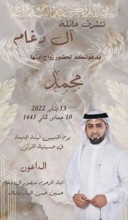 تحتفل عائلة آل دغام والدار مساء يوم الخميس بزفاف الشاب محمد منصور آل دغام على كريمة الحاج حسين حسن الدار وسط فرحة الأهل والأصدقاء ومحبي العريسين. وعبر العريس عن سعادته الغامرة بدخوله القفص الذهبي، سائلا الله أن يوفقه وعروسه ويرزقهما الذرية الصالحة. أسرة ”جهينة الإخبارية“ تهنئ العريسين وعائلتيهما وتسأل الله ان يبارك لهما، متمنين لهما حياة سعيدة ‏ ...